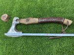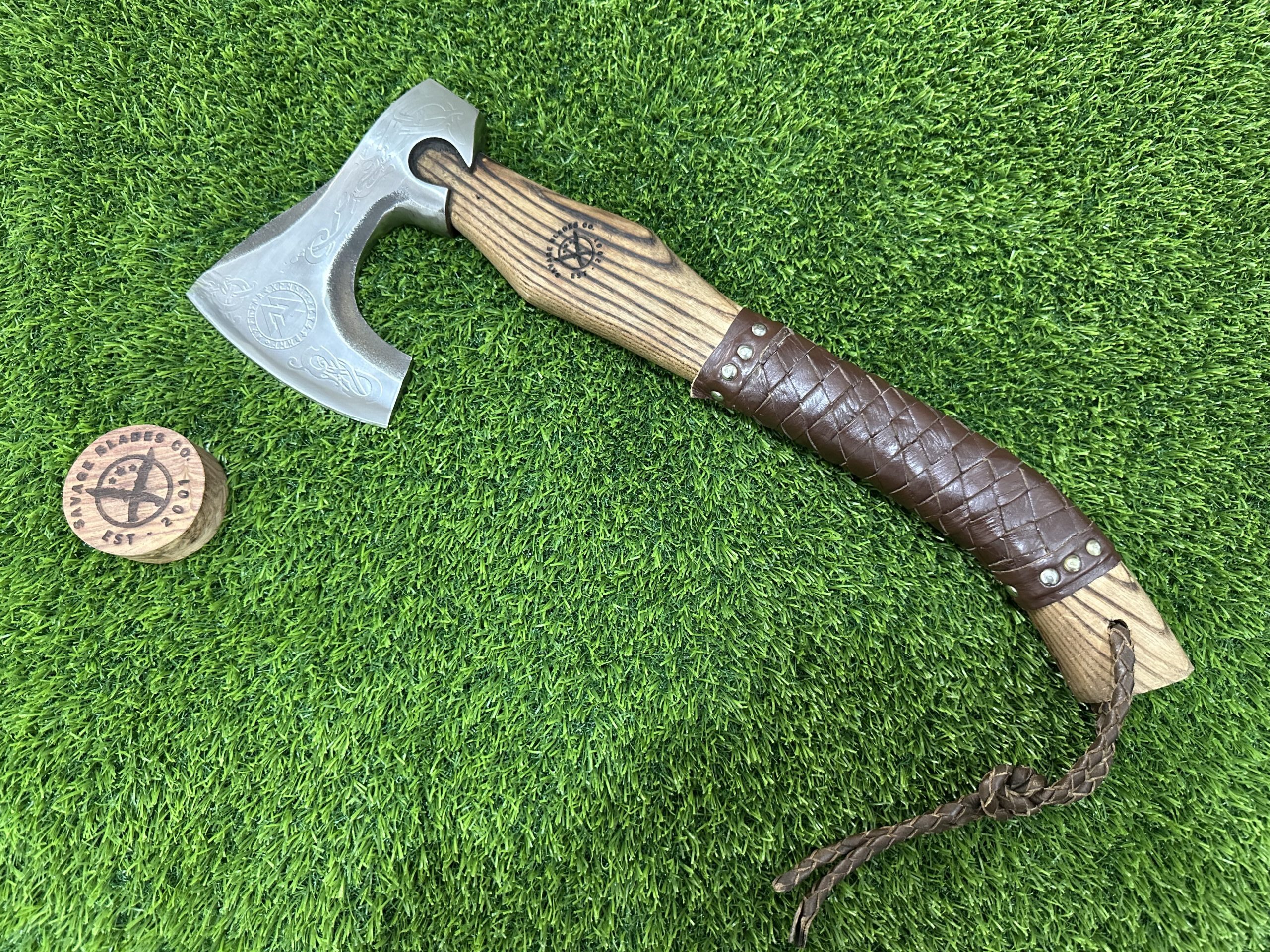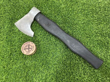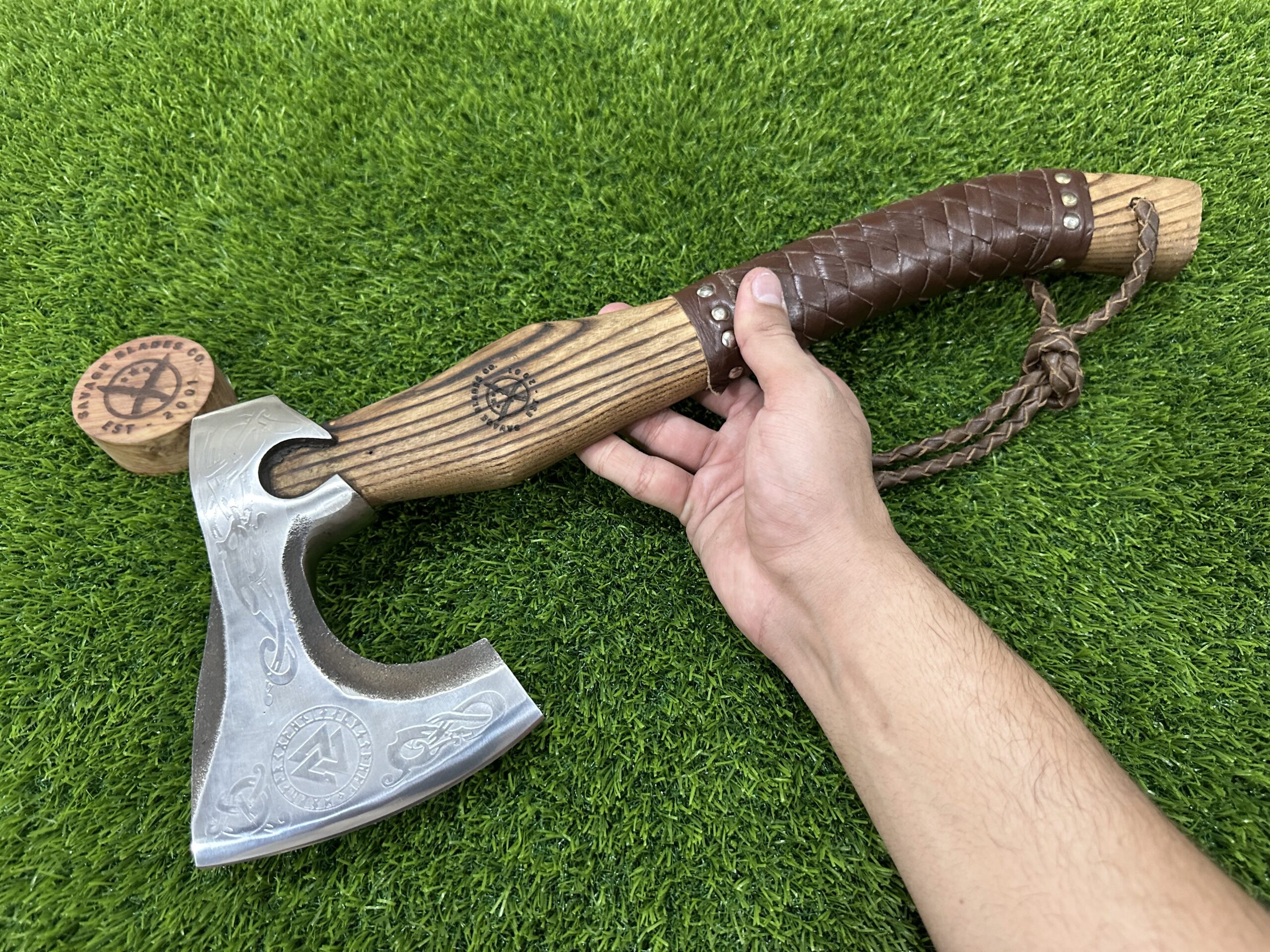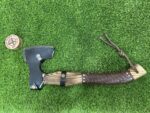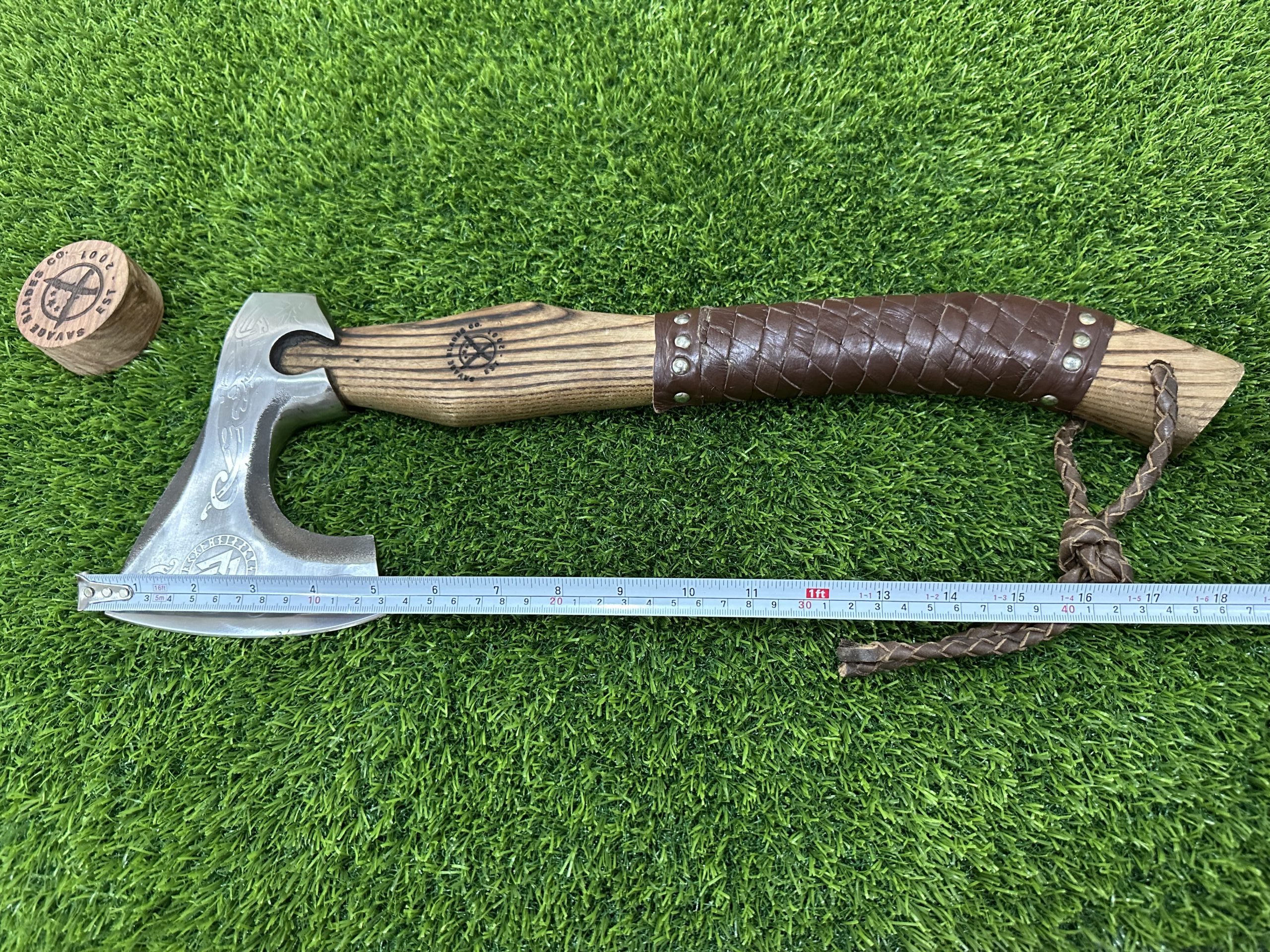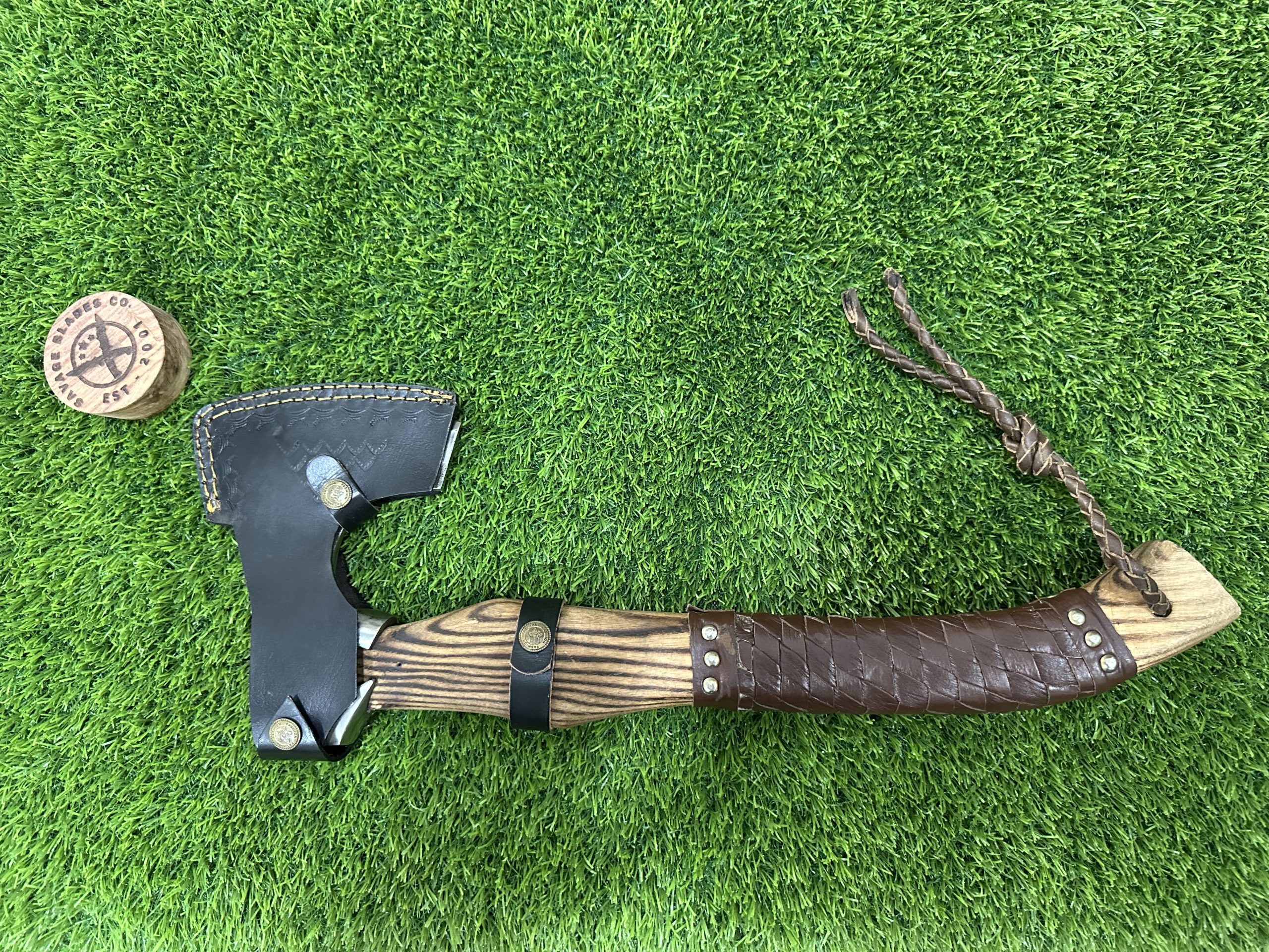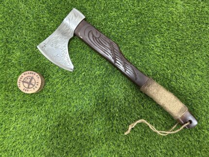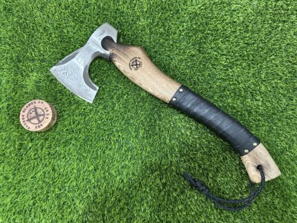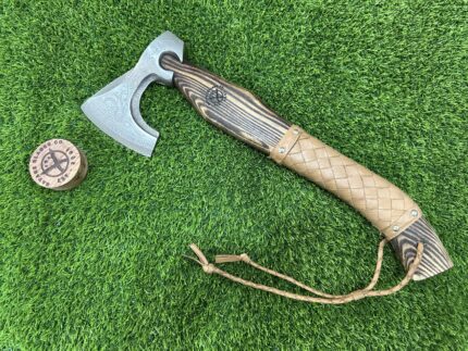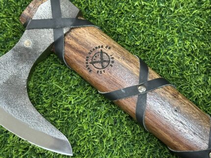 This axe comes with a custom leather sheath, hand-stitched for durability and designed for ease of use. The sheath features a belt loop, making it easy to carry the knife securely while hiking, hunting, or camping. Its rugged leather design complements the axe’s traditional appearance, offering both protection for the blade and convenience when transporting the knife.