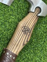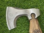 The pommel at the end of the handle may feature a simple but decorative brass or steel accent, providing a finishing touch that enhances the axe’s overall aesthetic and ensures additional durability.
