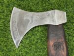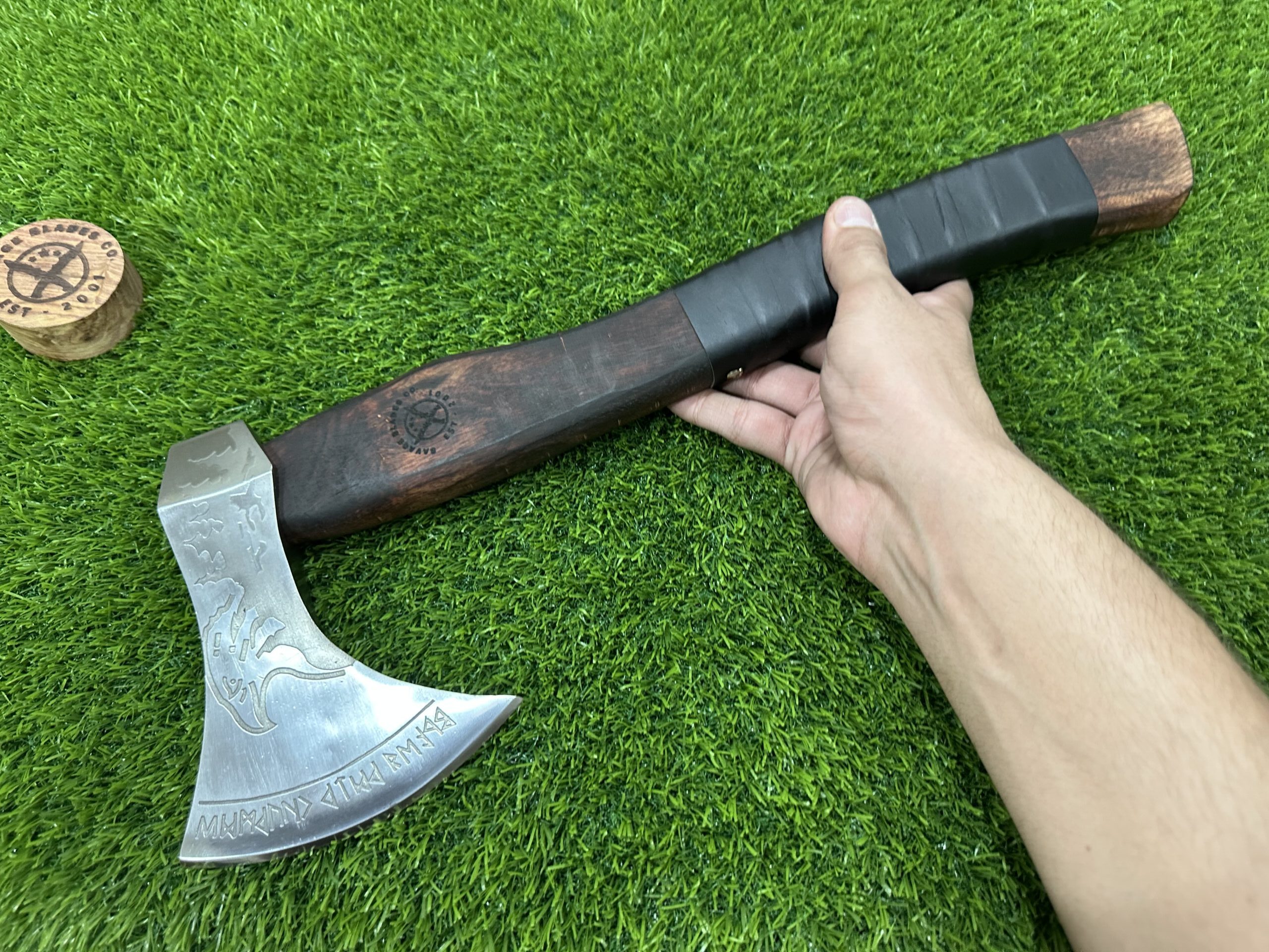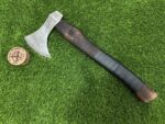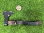 This axe comes with a custom leather sheath, hand-stitched for durability and designed for ease of use. The sheath features a belt loop, making it easy to carry the knife securely while hiking, hunting, or camping. Its rugged leather design complements the axe’s traditional appearance, offering both protection for the blade and convenience when transporting the knife.
