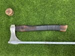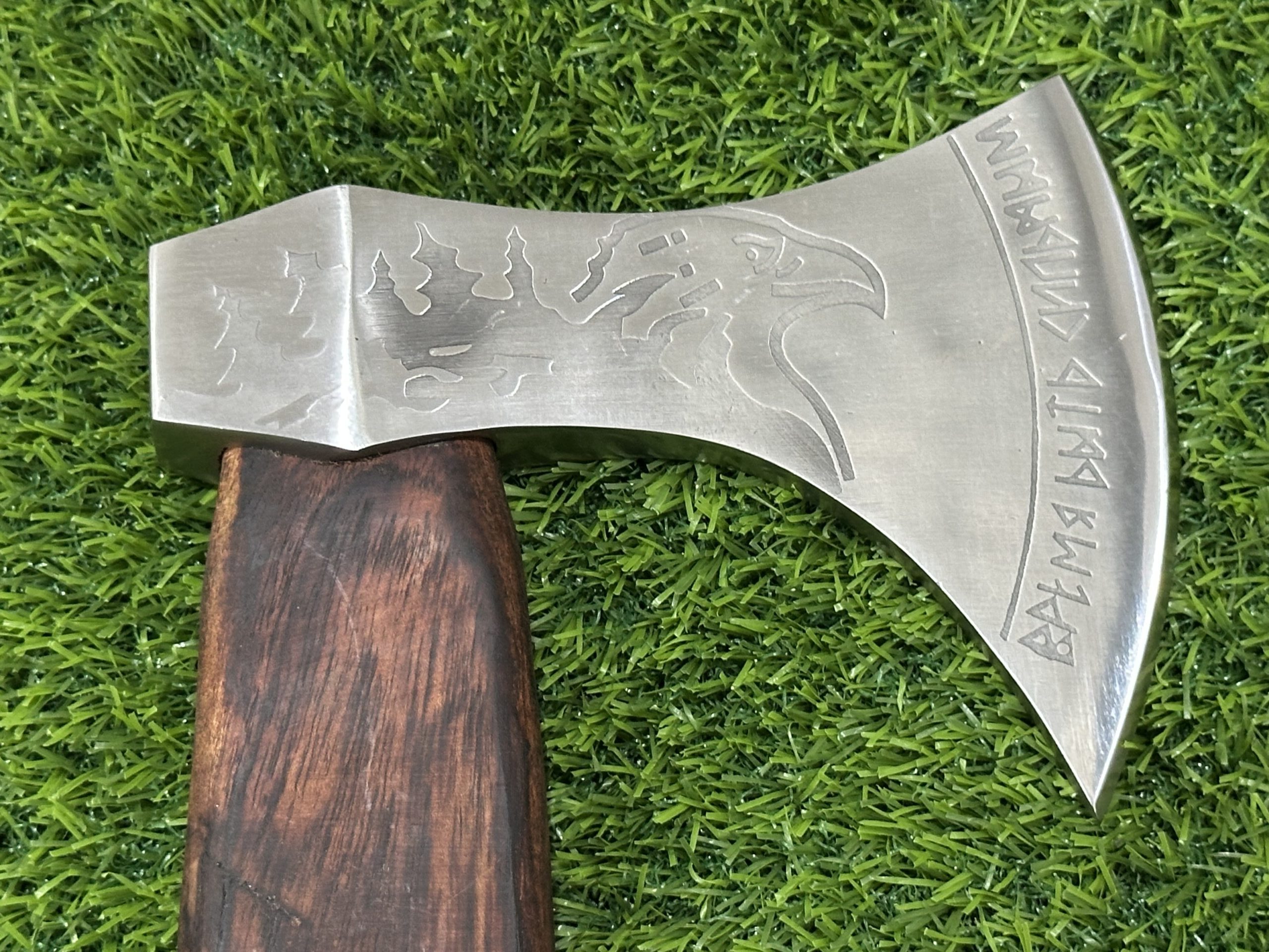 The pommel at the end of the handle may feature a simple but decorative brass or steel accent, providing a finishing touch that enhances the axe’s overall aesthetic and ensures additional durability.