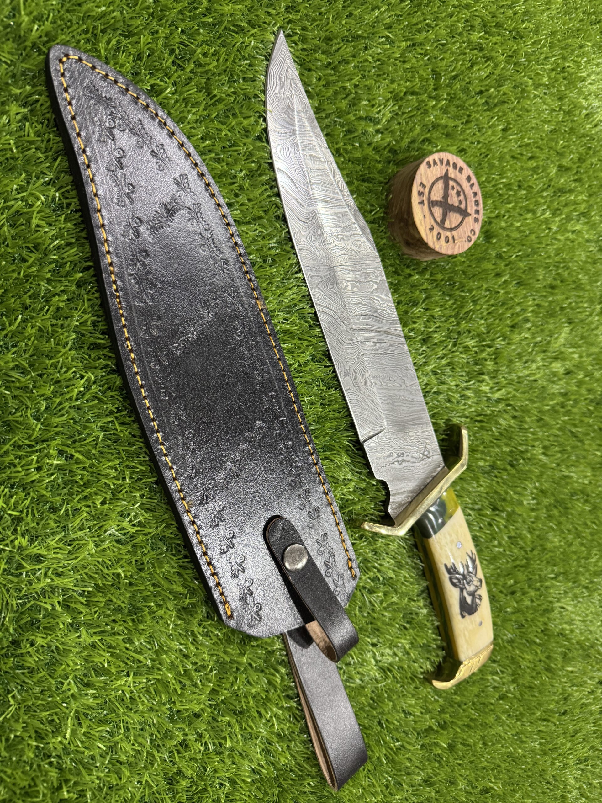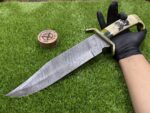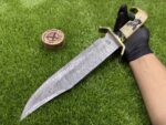 This Hunting Damascus Bowie comes with a custom leather sheath, hand-stitched for durability and designed for ease of use. The sheath features a belt loop, making it easy to carry the knife securely while hiking, hunting, or camping. Its rugged leather design complements the knife’s traditional appearance, offering both protection for the blade and convenience when transporting the knife.
