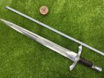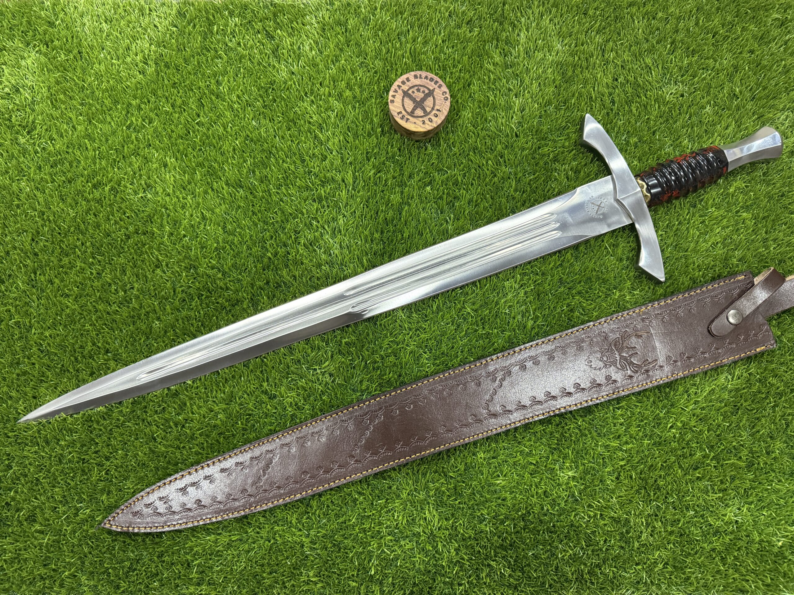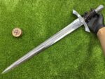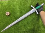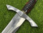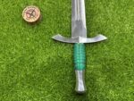 This sword comes with a custom leather sheath, hand-stitched for durability and designed for ease of use. The sheath features a belt loop, making it easy to carry the knife securely while hiking, hunting, or camping. Its rugged leather design complements the sword’s traditional appearance, offering both protection for the blade and convenience when transporting the knife.