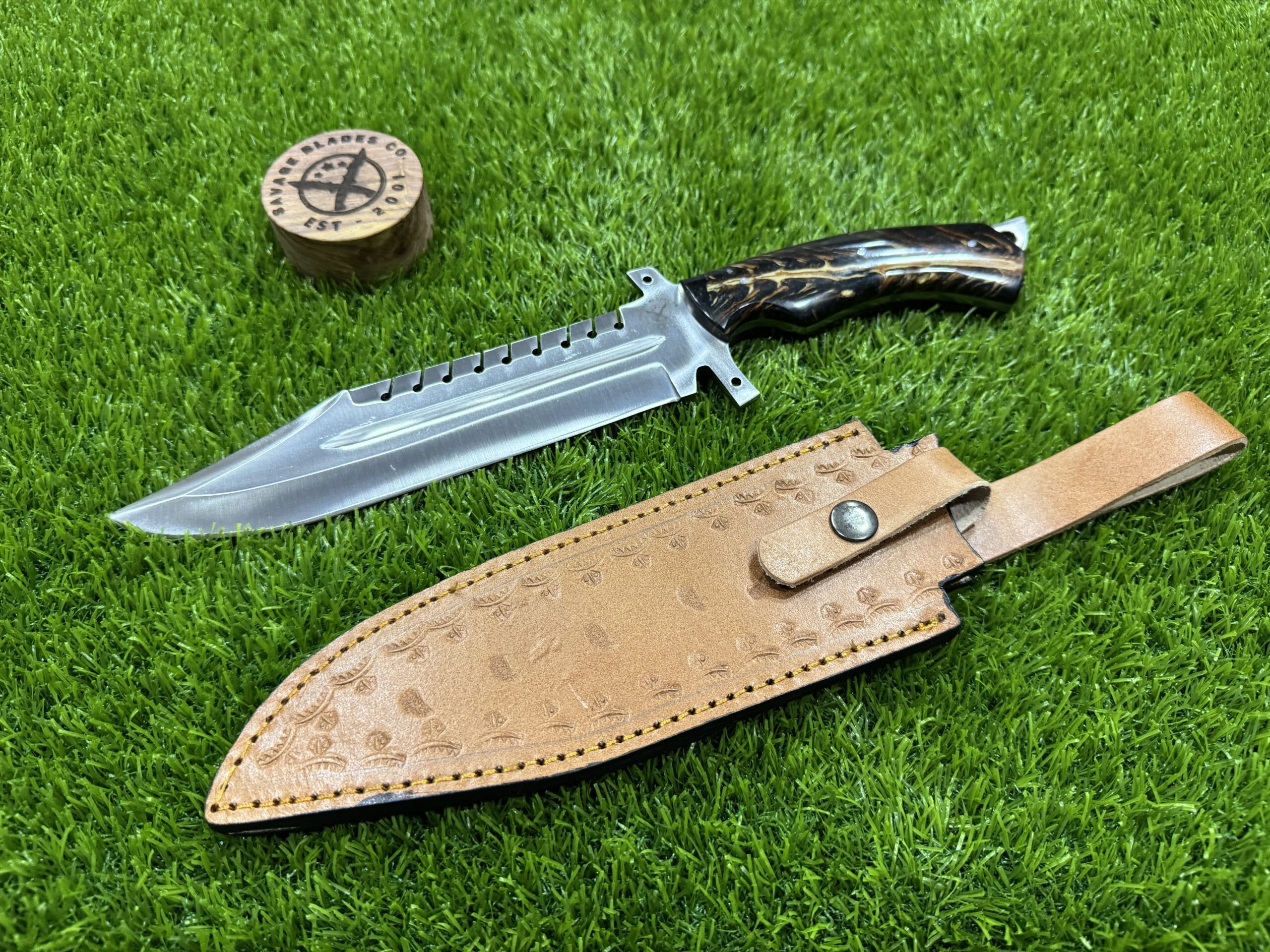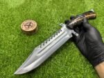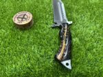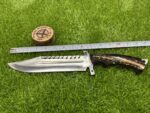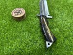 This knife comes with a custom leather sheath, hand-stitched for durability and designed for ease of use. The sheath features a belt loop, making it easy to carry the knife securely while hiking, hunting, or camping. Its rugged leather design complements the knife’s traditional appearance, offering both protection for the blade and convenience when transporting the knife.