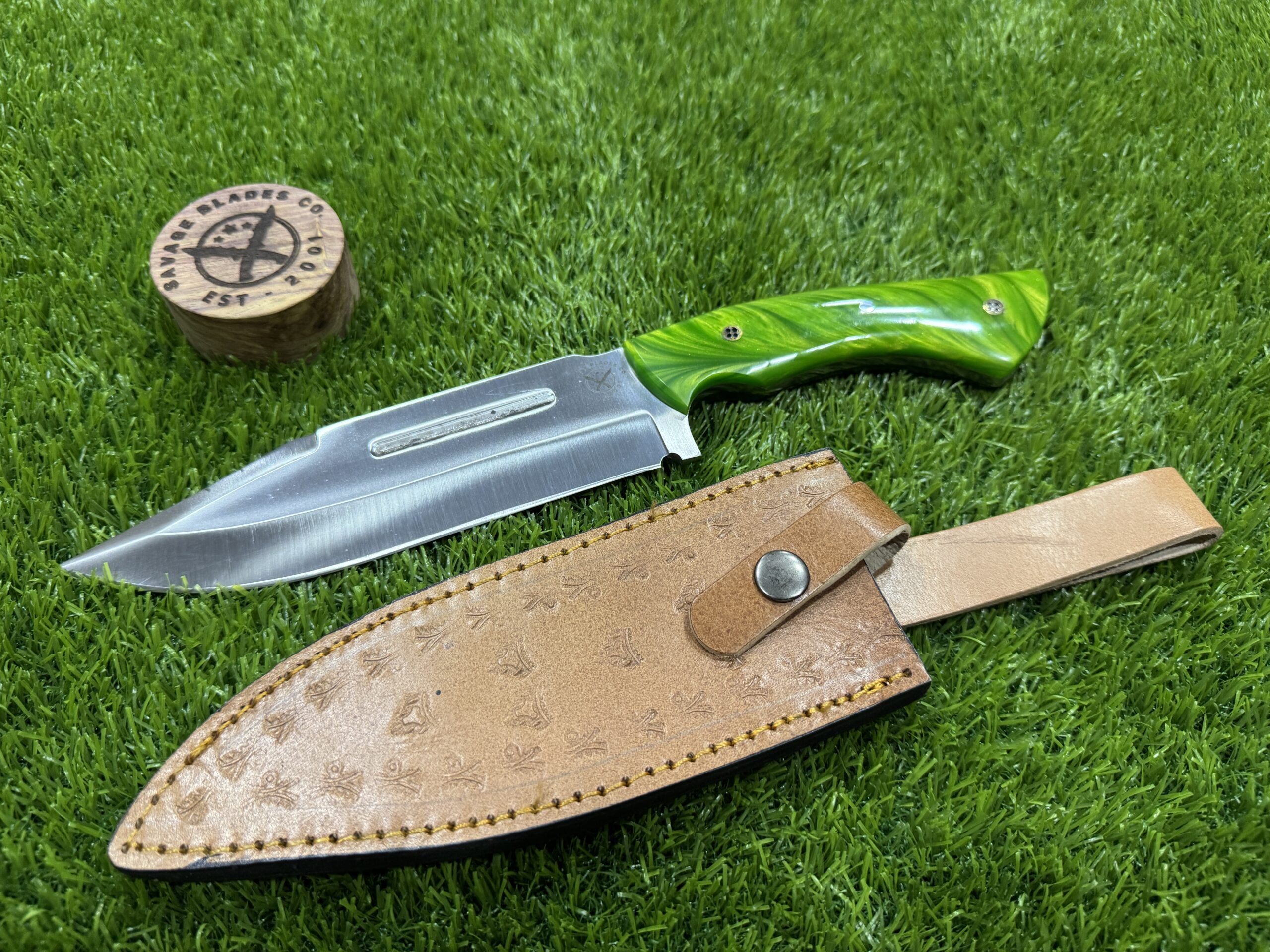 Shape: The blade features the classic Bowie knife shape, with a wide, slightly curved edge ideal for cutting, chopping, and slicing. Its broad surface area also makes it effective for skinning or heavy-duty tasks like splitting wood.