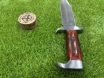 The pommel at the end of the handle may feature a simple but decorative brass or steel accent, providing a finishing touch that enhances the knife’s overall aesthetic and ensures additional durability.