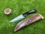 This knife comes with a custom leather sheath, hand-stitched for durability and designed for ease of use. The sheath features a belt loop, making it easy to carry the knife securely while hiking, hunting, or camping. Its rugged leather design complements the knife’s traditional appearance, offering both protection for the blade and convenience when transporting the knife.