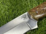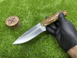The pommel at the end of the handle may feature a simple but decorative brass or steel accent, providing a finishing touch that enhances the knife’s overall aesthetic and ensures additional durability.