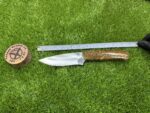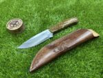 This knife comes with a custom leather sheath, hand-stitched for durability and designed for ease of use. The sheath features a belt loop, making it easy to carry the knife securely while hiking, hunting, or camping. Its rugged leather design complements the knife’s traditional appearance, offering both protection for the blade and convenience when transporting the knife.