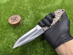 The pommel at the end of the handle may feature a simple but decorative brass or steel accent, providing a finishing touch that enhances the knife’s overall aesthetic and ensures additional durability.